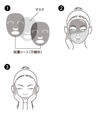 ③10分~20分後ゆっくりとマスクを取り、肌に残っている液を優しくなじませます。アルミ袋に残った美容液はマスクを取り外した後お肌に十分になじませてください。
